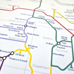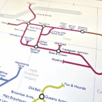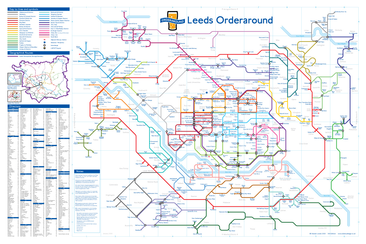 This map shows pubs and bars in the style of the London Underground diagram, covering the Leeds District area.
